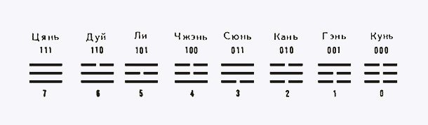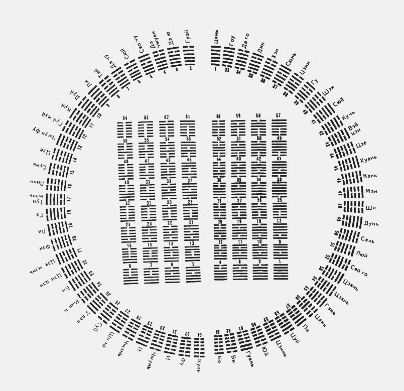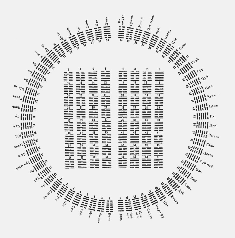 Окружающий нас мир дуален, свет и тьма, мягкое и твердое, податливое и проникающее. Противоположности рифмуются, дополняя друг друга, и сменяются, подчиняясь какому-то неведомому ритму. Китай воспринял двоичный код Фу Си с удивительно юной и свежей поэтичностью. Восемь возможных комбинаций из трех прерывистых и непрерывных черточек наполнялись образами и значениями, становились водой или деревом, младшим сыном или старшей сестрой, творческим порывом, уносящим в небо, или созидательным началом, позволяющим прорасти зароненному в него семени. Можно сказать, что в то время, когда на Западе шел процесс формирования антропоморфных богов, на востоке одухотворяли комбинации из прерывистых и непрерывных черточек и изучали связи между ними.