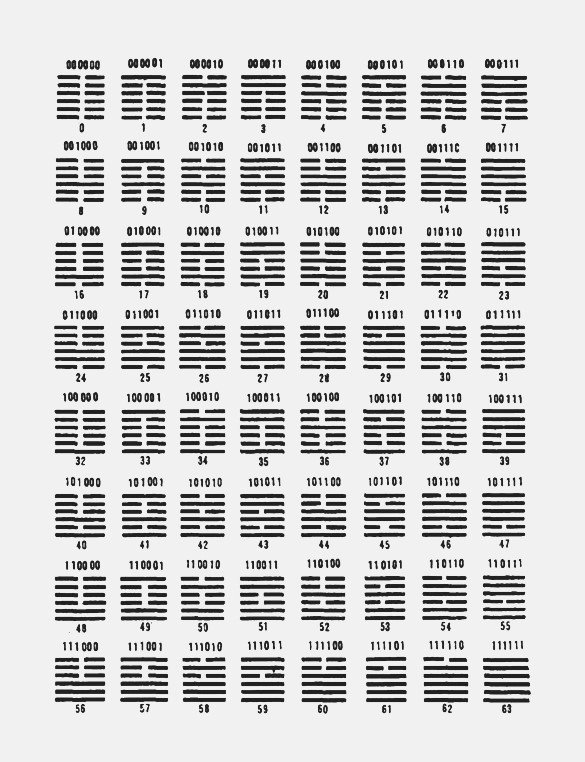 Чтобы сделать свое послание заметным для людей будущего, Фу Си расположил эти восемь триграмм и шестьдесят четыре гексаграммы в линию, квадратом и по окружности, строго соблюдая последовательность двоичного кода.
